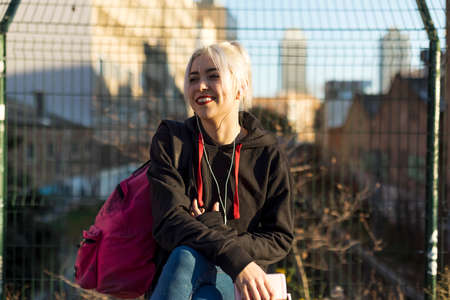 Beautiful young happy smiling woman against the background of a European city in the sun at sunset, student and traveler, vacation in the city