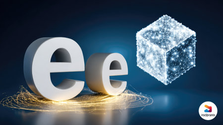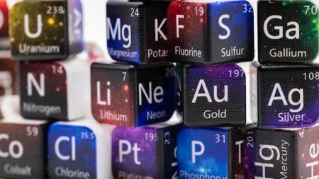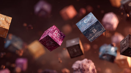 Colorful cubes with symbols representing elements float in a dynamic space, creating a visually appealing scene with swirling particles and vibrant colors.