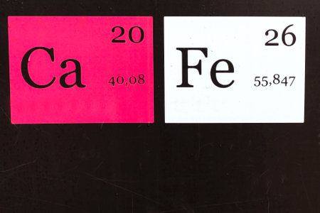 Chemical elements calcium and ferrum.Names and abbreviation of chemical elements. Calcium and ferrum in the chemical table. Copyspace. The concept of science, chemistry, research.