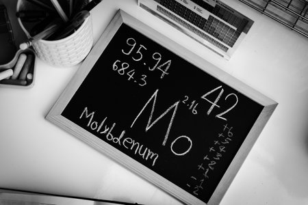 Molybdenum and symbol structural formula chemical on the blackboard, Chemistry in the classroom