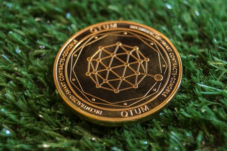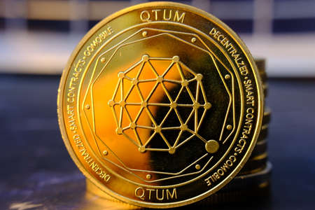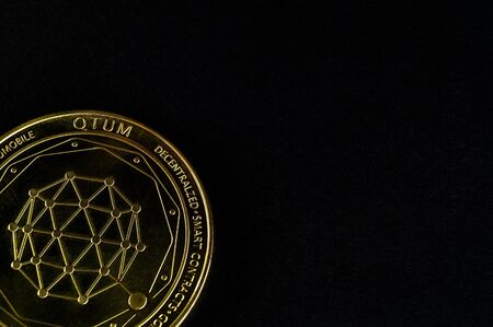 Coin cryptocurrency qtum close-up of the colour-coded keyboard background
