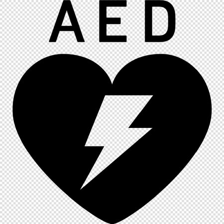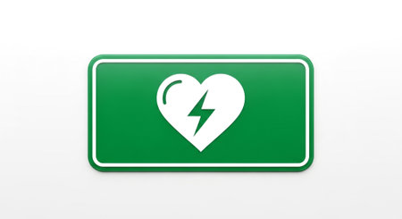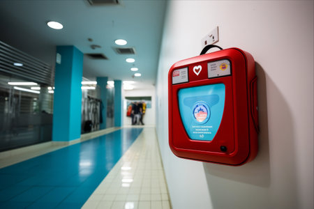 Automated external defibrillator symbol or sign on the wall in a sports gym. Generative AI