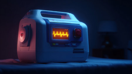 An advanced medical device showcasing a heartbeat pattern illuminates a dimly lit room, creating an atmosphere of clinical importance and safety.