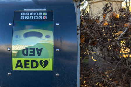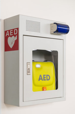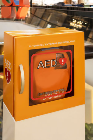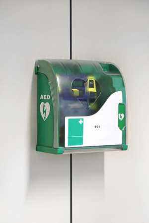 Public access AED defibrillator for emergency first aid on a wall. A life-saving device for cardiac arrest in a public space like an airport.