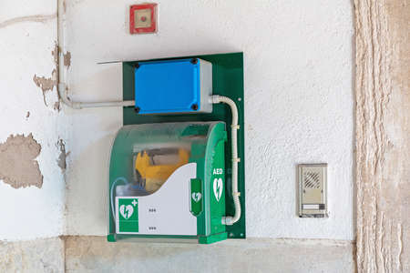 Vienna, Austria - August 30, 2020: Automated External Defibrillator (AED) in white box on the wall.