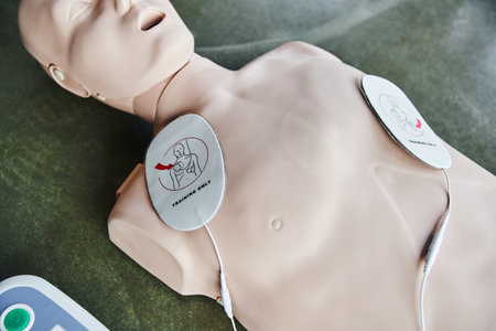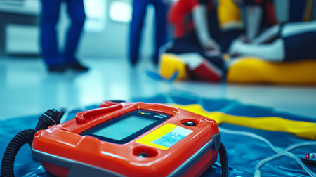 This image showcases a defibrillator in a simulated emergency medical training session, highlighting lifesaving techniques and response readiness in healthcare practice.