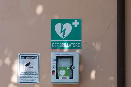 Aed Defibrillator Emergency Equipment Box at Wall in Venice Italy