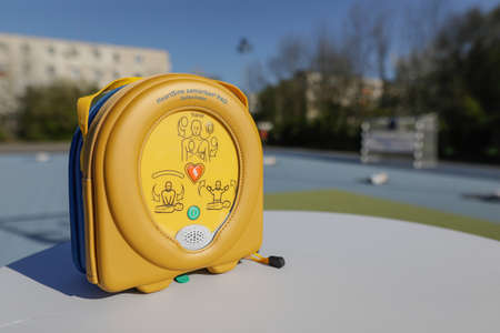 Ploiesti, Romania - April 13, 2022: Details with an automated external defibrillator used for training.