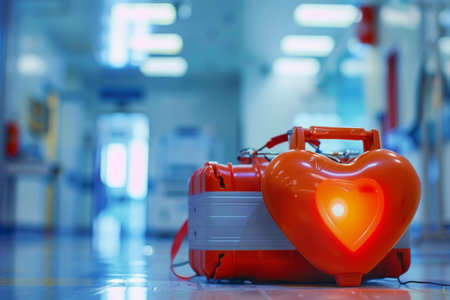 Portable defibrillator standing on the floor in a hospital corridor, ready to provide life saving defibrillation