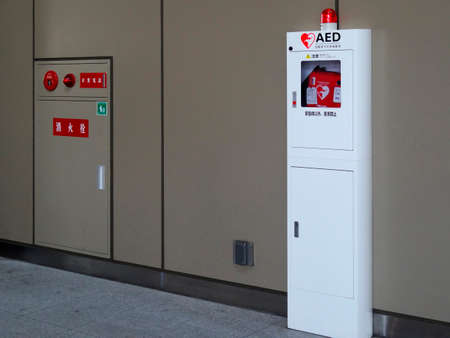 Shirakawa, Japan - 14 FEB 2017: Automated External Defibrillator (AED) on the wall can be found in almost all train station in Japan.