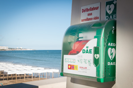 Sables-d-Olonnes, France - July 05, 2016 : AED - public automatic defibrillator on the bitch with french sign : defibrillator with video control