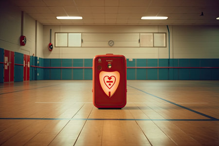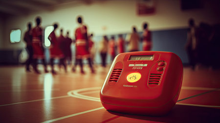 Automated external defibrillator symbol or sign on the wall in a sports gym. Basketball players was playing in blurred background. Generative AI