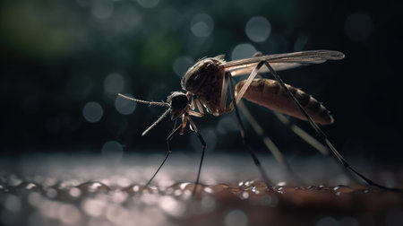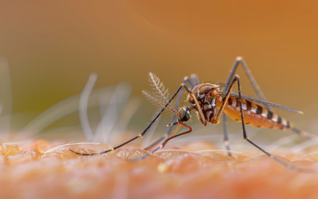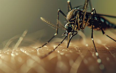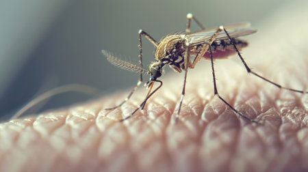A mosquito closeup on human skin, feeding with fine detail, natural lighting creating a vivid macro perspective