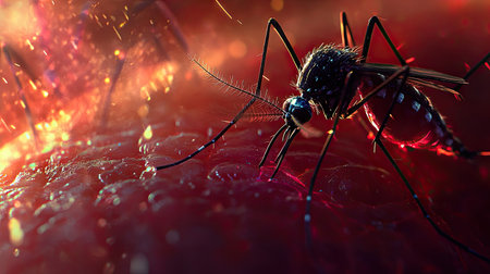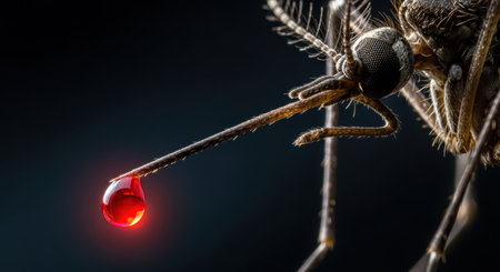 Close up macro shot of a mosquito proboscis with a glowing red blood drop at its tip, symbolizing disease transmission, virus spread, and health risks.