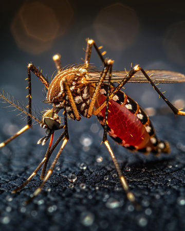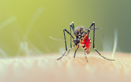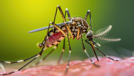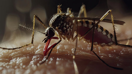 A detailed macro shot captures a mosquito with a blood filled abdomen actively feeding on human skin, highlighting the insect intricate features and the act of biting.