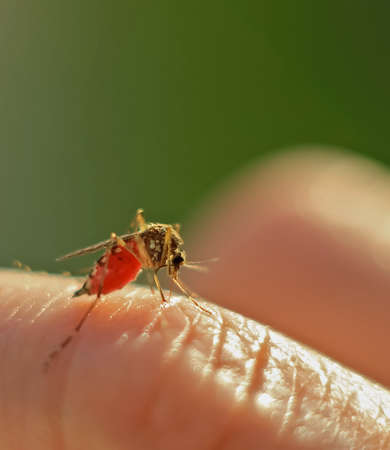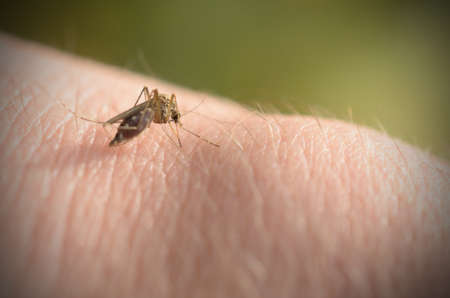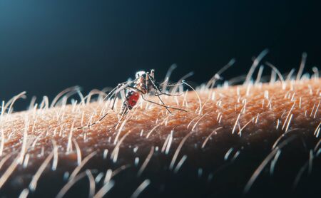 Mosquito with a syringe injection mouth drawing blood from a human skin.