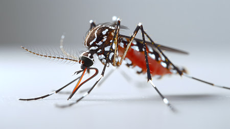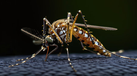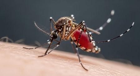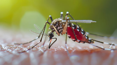 Macro shot of an Aedes aegypti mosquito with distinct black and white stripes biting human skin, its abdomen visibly filled with blood. This insect is a common vector for tropical diseases.