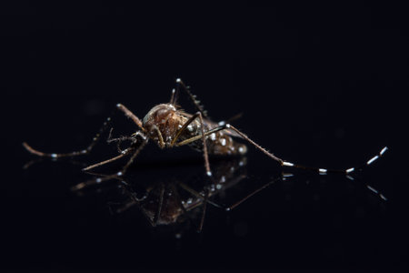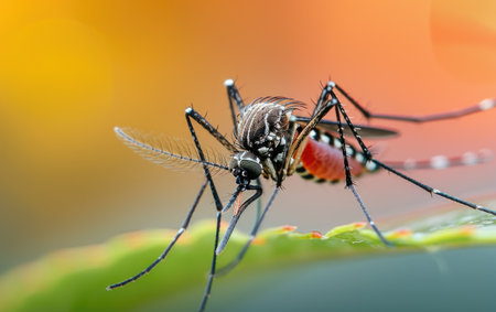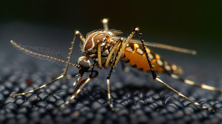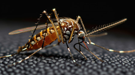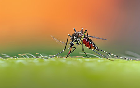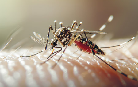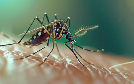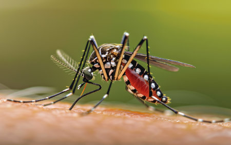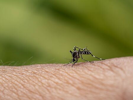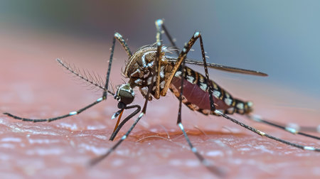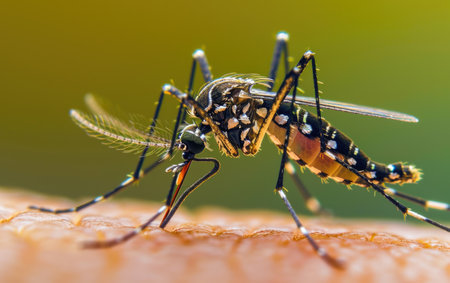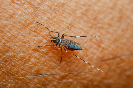 Aedes mosquito, known for transmitting diseases, feeding on human skin in a high-magnification view.