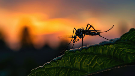 Mosquito sitting on a leaf, highlighted against the evening sky