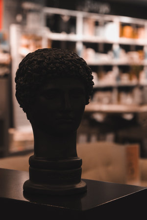 Statue of a head in a shop window.