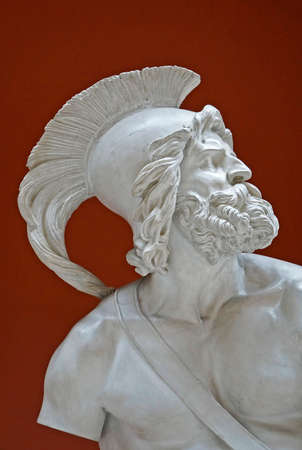 Stone face. Head detail of the ancient man sculpture. Antique marble statue of mythical hero character