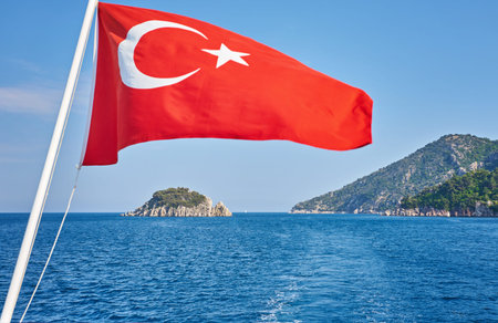 Turkish National Flag waiving on the wind on Mediterranean Sea in Kemer (Antalya), Turkey.