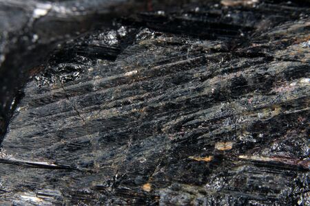 A macro close-up of a black mineral rock with a rough, layered texture and shiny facets, resembling coal or obsidian. The detailed surface patterns and dark tones create a strong, natural abstract background.