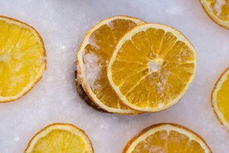 Merry Christmas and New Year greeting card with dry orange, Clementines tangerines on snow as background