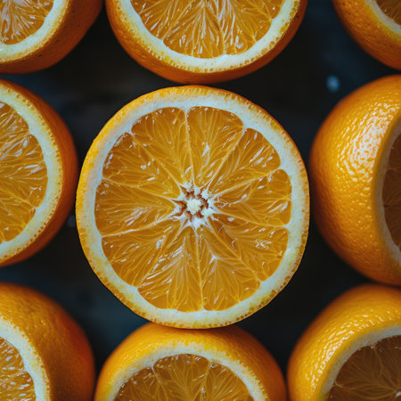 Slices of oranges arranged in a symmetrical pattern on a dark table, forming a striking food background