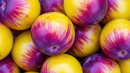 A variety of ackee apples showcase a vibrant display of colors, surrounded by fresh green leaves in a lively market. This fruit evokes the spirit of Jamaican culture.