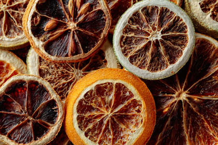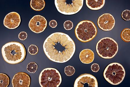 Dried orange slices background. Dehydrated crispy fruit slices. Pile of sun-dried crunchy oranges. Healthy meal snack. Top view.