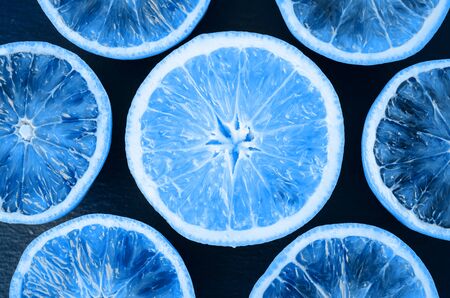 Sliced fruit oranges in checkered pattern on violet background. Fruit background from a slice of oranges. Demonstrating very peri, color of 2022 year.