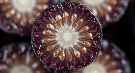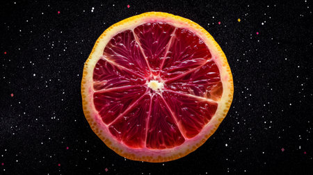 Close up of half a burgundy lemon slice on black background with small stars in futuristic style --ar 16:9 --v 6 Job ID: ba516fc0-c6e0-4c5a-91c3-6b3cf9b25227