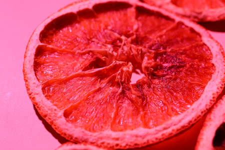 Pattern made of dried orange slices on a coral background. Artistic concept.