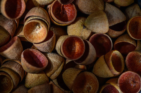 Heap of processed areca nuts cut in half revealing deep orange brown radial internal structure and dry exterior