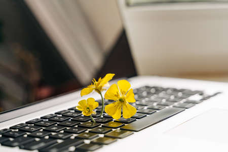 Laptop keyboard with yellow flower growing on it. Green IT computing concept. Carbon efficient technology. Digital sustainability