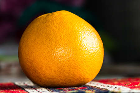 Meyer lemon of orange color originating in China taken from 45 degree angle on the black reflective background.
