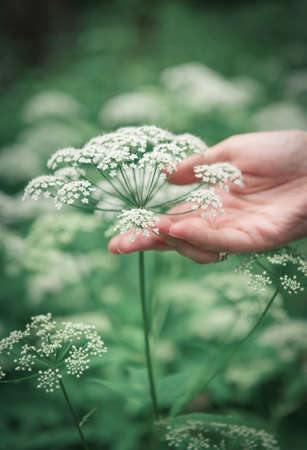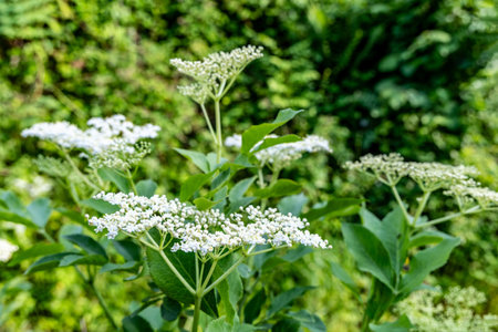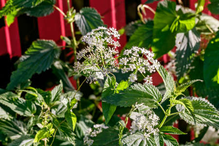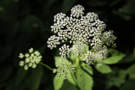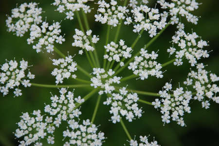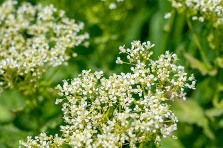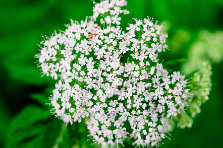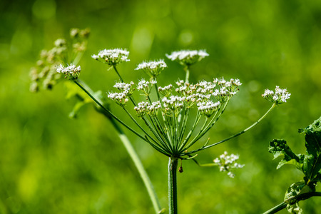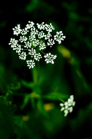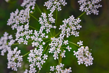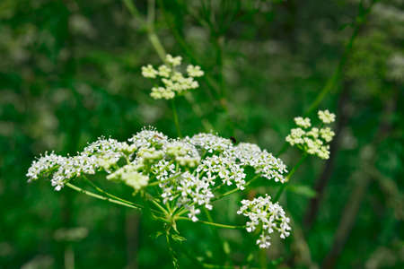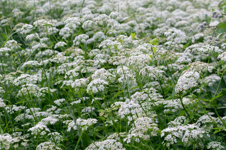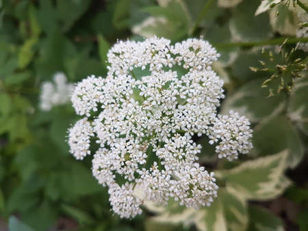 View of meadow white flower of Aegopodium podagraria L. called ground elder, herb gerard, bishop's weed, goutweed, gout wort, snow-in-the-mountain. Small white flowers as romantic wedding background