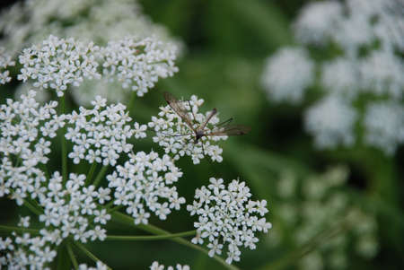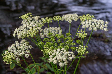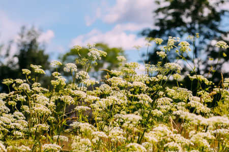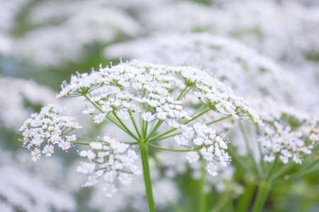 White lacy flowers of goutweed aegopodium podagraria against blurred background