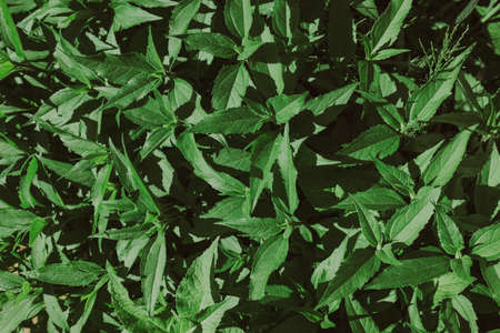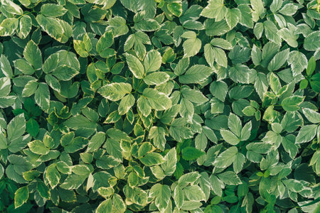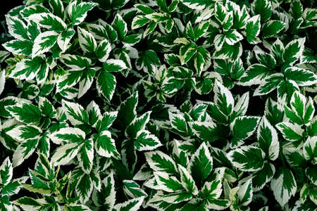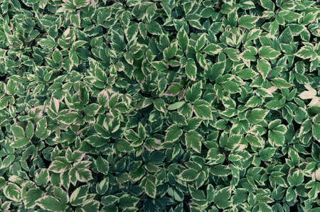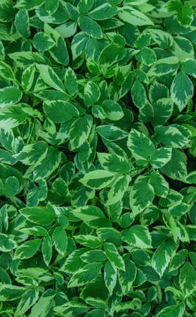 decorative background of green leaves of the plant Runny vulgaris Variegata. carpet of green natural plant leaves top view