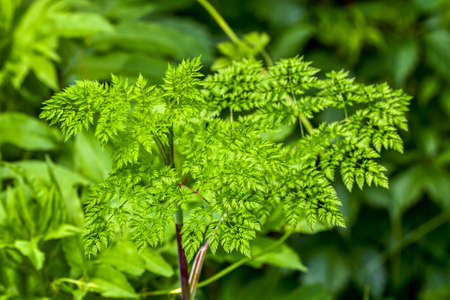Green Hemlock flowers and leaves nature background. Nature hemlock background. Green hemlock foliage texture, leaf nature background.