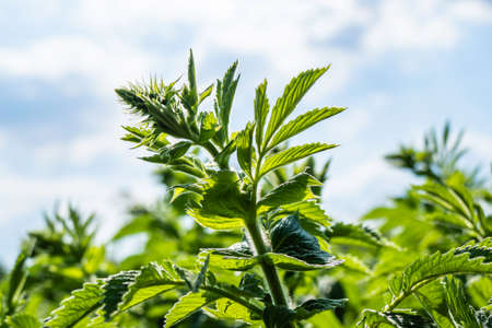 Wild cow parsley flowers amongst healthy green stinging nettle foliage