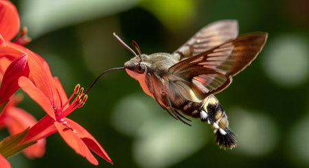 Immerse yourself in the intricacies of nature as a meticulously captured macro photograph reveals the exquisite details of an insect in flight Hovering above a reflective surface, its delicate wings unfurl like intricate lace, while its body texture emerges in sharp relief Bathed in natural light, the subject stands out against a blurred backdrop, inviting viewers to marvel at the beauty and complexity of the natural world AI Generative