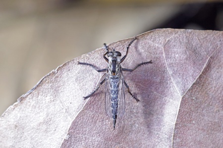 a robber fly is staying on the dropped leaf from the upper view