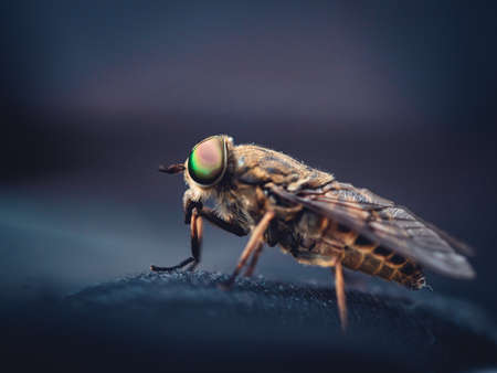 A selective focus shot of a housefly with a dark blurry background