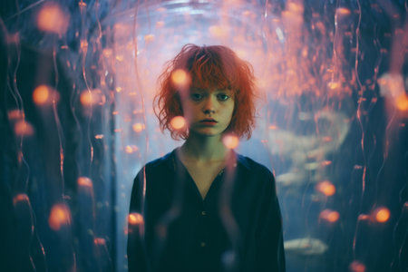 Glamorous underwater portrait, mysterious female face distorted by water surface movement
