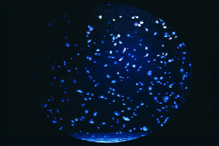 Numerous jellyfish with luminous circular bodies drift in dark blue water. The scene displays a focus on the jellyfish forms with an overhead perspective. The image uses a cool color palette with high contrast, suggesting a deep-water environment. Suitable for conceptual design, science publications, or educational resources.