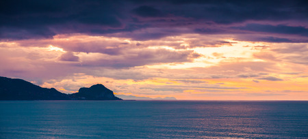 Dramatic sunset over Porto Conte bay from Cacccia cape. Fantastic Mediterranean seascape. Location: Porto Conte, Alghero, Province of Sassari, Italy, Europe
