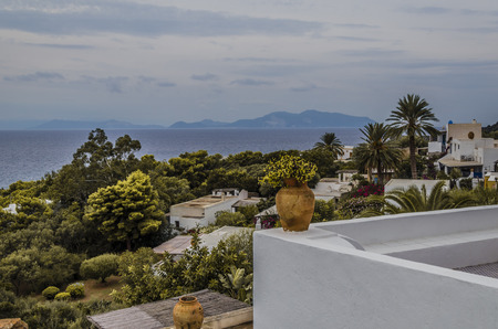 View of vegetation on the island of panarea and background the sea tyrrhenian with other Aeolian islands on the horizon