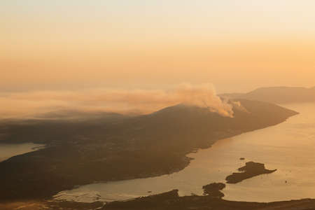 A column of smoke on the Lustica Peninsula in Montenegro. Wildfires rage at sunset.